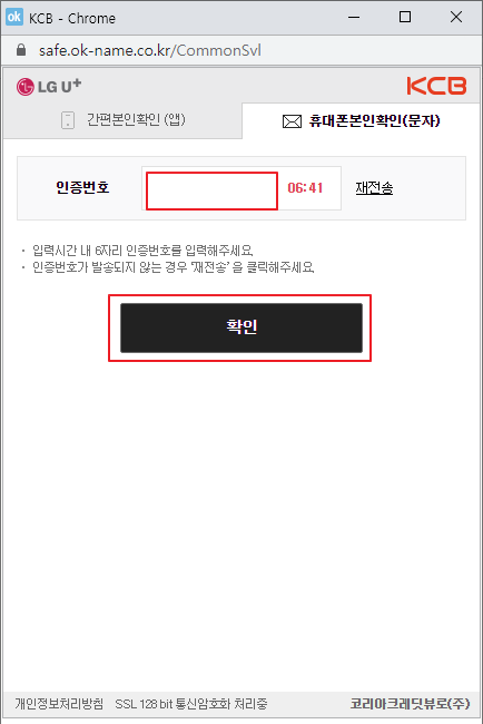 인증 문자가 휴대폰으로 오면 인증 번호를 입력 해 주신후 확인 버튼을 누릅니다.