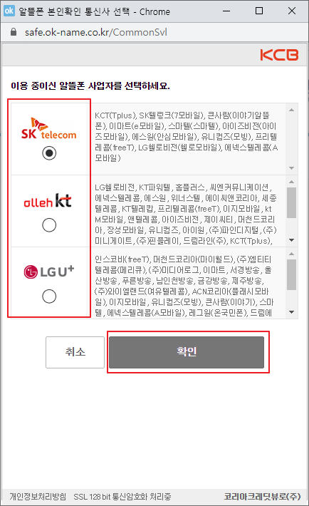 해당하시는 통신사를 선택 하신후 확인 버튼을 눌러주신후