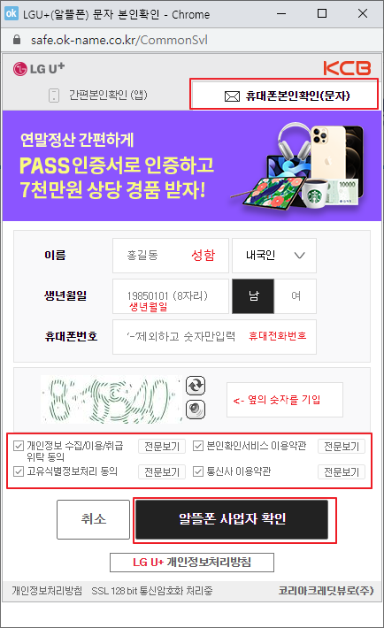 이름, 생년월일, 휴대폰번호 등을 넣어 주신후 동의 사항을 체크 하신 후 확인 버튼을 누릅니다.
