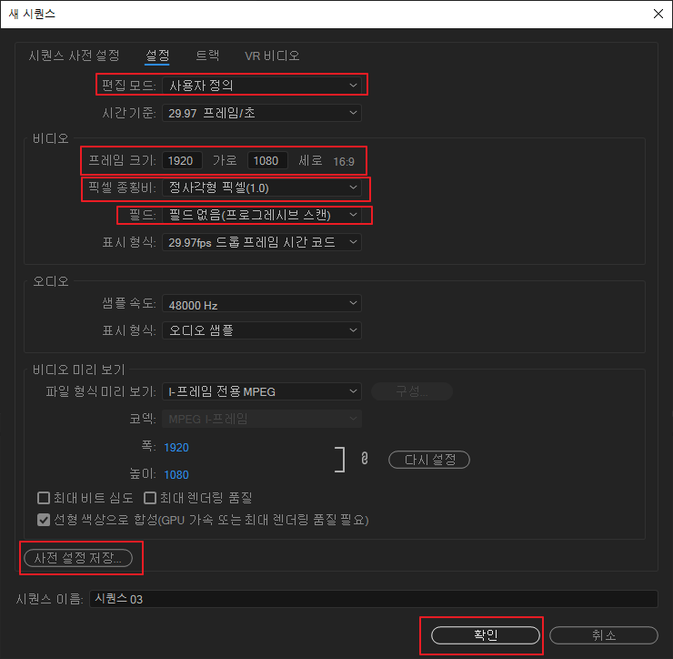 시퀀스는 그림을 그릴 때 사용하는 도화지와 같다고 생각하시면 좋겠습니다. 시퀀스 사전 설정 탭에서 아무거나 클릭한 뒤에 설정 탭을 클릭하고 편집모드를 사용자 정의로 바꿔주시면 됩니다. 다른 설정들은 아래 사진과 동일하게 맞춰주시면 됩니다.