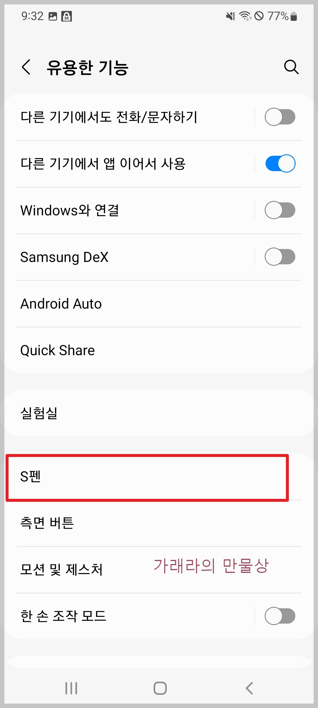 ■ 3단계는 유용한 기능에서 아래로 내리면 "S펜" 항목이 있습니다. 이 항목을 클릭